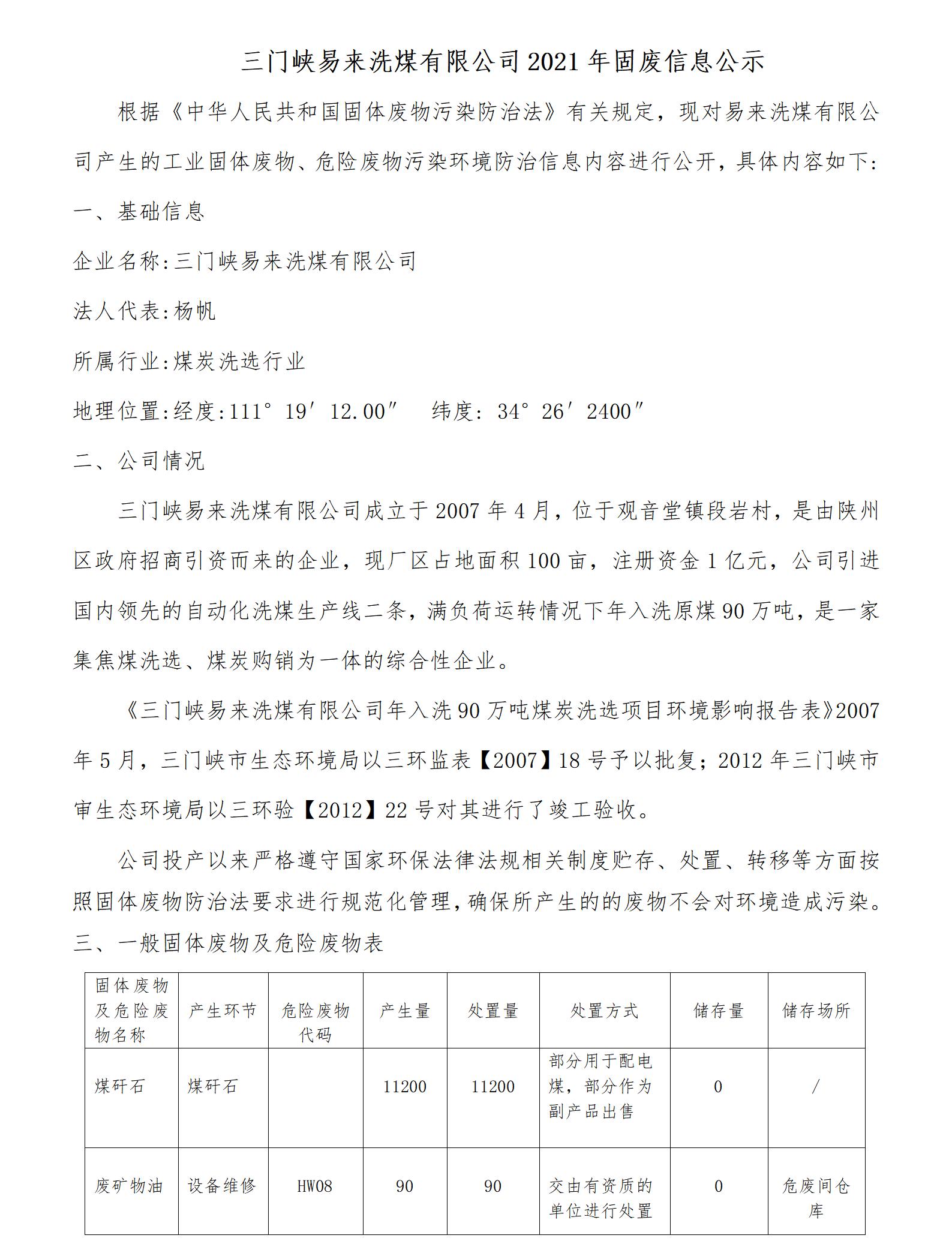 三門峽易來洗煤有限公司2021年固廢信息公示